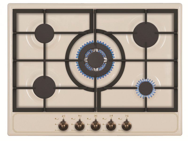 - WOK конфорка (3600 Вт), 2 конфорки повышенной мощности (3000 Вт), 1 стандартная конфорка(1750 Вт), 1 экономичная конфорка (1000 Вт)